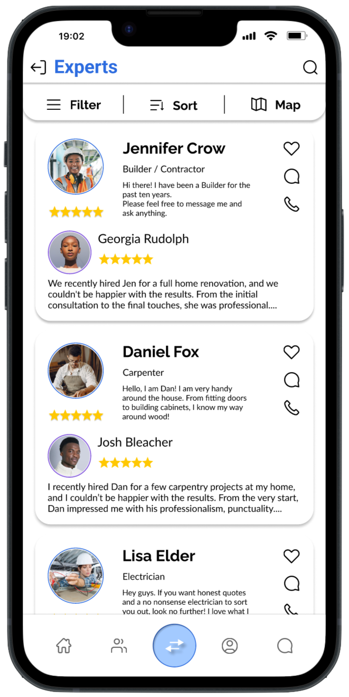 The original objective was reflected in the final results of the app. With users being able to contact experts quickly and with ease. They were able to asks questions and gauge trust based on expert reviews. While the functionality of the app lined up with the original objective, the over all look and features of the app were, in the end, quite different. For example, the features included in the bottom navigation were changed along with the onboarding process after having conducted the usability tests. This was a pivotal point in the development of Expert Exchange which helped us to understand how users would interact with the app.